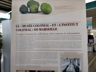 On y rappelle l’histoire du musée et de l’institut colonial fondés par Édouard Heckel, détenteur de la chaire de botanique de 1877 à 1913 à la faculté des sciences. Il est aussi le promoteur de l’exposition coloniale de 1906 à Marseille. Les auteurs de l‘exposition nous informent qu’ils voudraient ainsi ouvrir la voie à la mise en place d’un futur musée modernisé qui inviterait le public a apprécier la diversité des apports coloniaux en stimulant « les imaginaires » tout en poussant à « l’analyse critique de l’héritage colonial ».