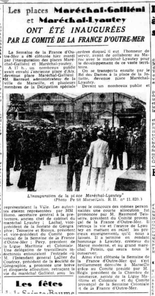 la place Maréchal-Gallieni mais aussi une place Maréchal-Lyautey (actuelle place de la Joliette) en présence de Raymond Teisseire président du comité Provençal de la France d’Outremer. Teisseire a