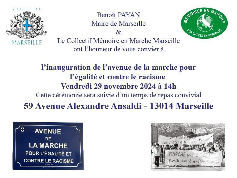 À l’occasion des 40 ans de l’anniversaire de la marche pour l’égalité et contre le racisme, pendant une année. Cette année a été lancé par monsieur le maire Benoit Payan, au palais du Pharo. A cette occasion, tel le bouquet final d’un feu d’artifice, il a annoncé à toute la France, que Marseille n’aurait pas une rue, mais une avenue « marche pour l’égalité et contre le racisme ». Marseille, toujours dans l’exagération !
